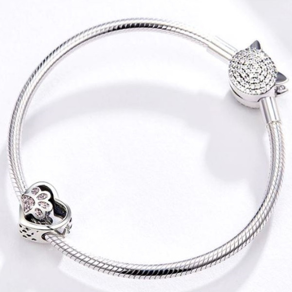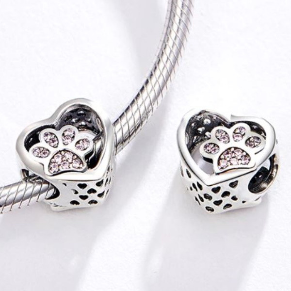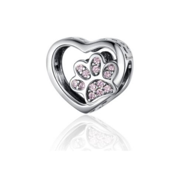 Prívesok v tvare srdca zo striebra so psou labkou zdobenou ružovým zirkónovým kryštálom. Dá sa nosiť na náramku alebo náhrdelníku. Veľkosť 1,0 × 1,2 cm Prívesok je kompatibilný s náramkami typu Pandora a Pandora.