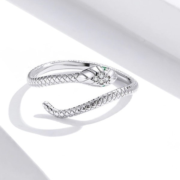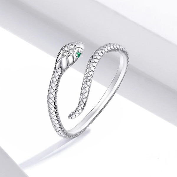 Prsteň vyrobený zo striebra, zobrazujúci hada, zdobený kryštálom zirkónu. Nastaviteľná veľkosť, hrúbka 0,2 cm, hmotnosť 1,8 g.