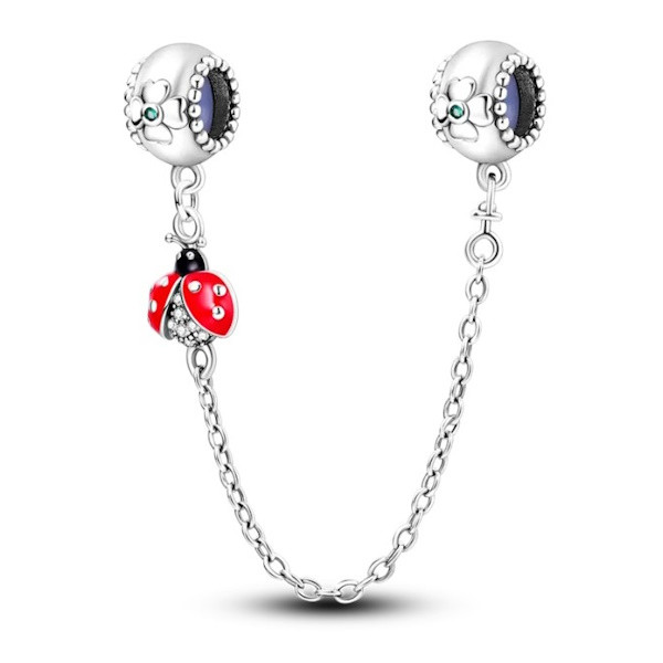 Vyrobené zo striebra, zdobené zirkónovým kryštálom, s bezpečnostnou retiazkou. Dĺžka retiazky je 75 mm, veľkosť lienky je 9,5 mm, priemer korálky na zatváranie je 10 mm, otvor má priemer 5,5 mm.