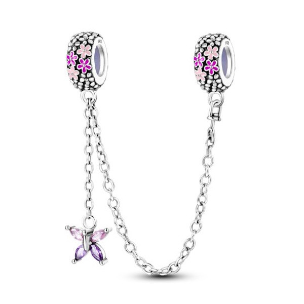 Vyrobené zo striebra, s pôvabnou bezpečnostnou retiazkou zdobenou farebnými zirkónovými kryštálmi. Dĺžka retiazky je 58 mm, priemer korálky na zapínanie 10,6 mm, otvor 4,6 mm.