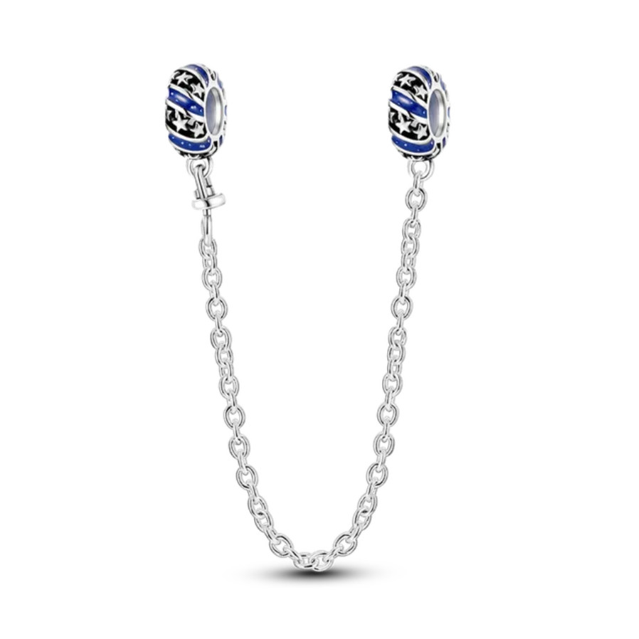 Strieborný prívesok s bezpečnostnou retiazkou. Dĺžka retiazky je 58 mm, priemer korálky na zapínanie 9,8 mm, otvor 4,6 mm.
