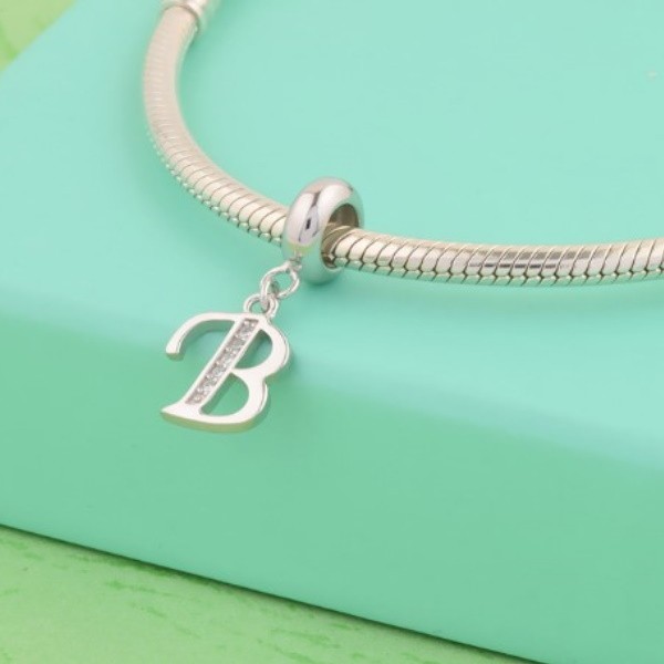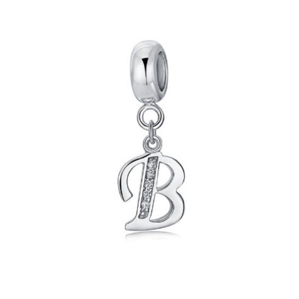 Prívesok zo striebra znázorňujúci písmeno B na náramky a náhrdelníky. Veľkosť 2 × 1 cm, váha 0,8 g. Veľkosť otvoru je 0,45 cm Prívesok je kompatibilný s náramkami typu Pandora a Pandora.