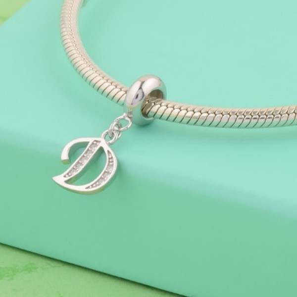 Prívesok zo striebra znázorňujúci písmeno D na náramky a náhrdelníky. Veľkosť 2 × 1 cm, váha 0,8 g Veľkosť otvoru je 0,45 cm podľa toho je kompatibilný s náramkami Pandora a Pandora: v prípade produktu nad 2g vyrazené alebo vygravírované meno a/alebo punc výrobok potvrdzuje. Oddelením testované 925 jemné striebro s vlastným menom a/alebo puncom. Registračné číslo licencie našej spoločnosti na distribúciu drahých kovov: PR7959.