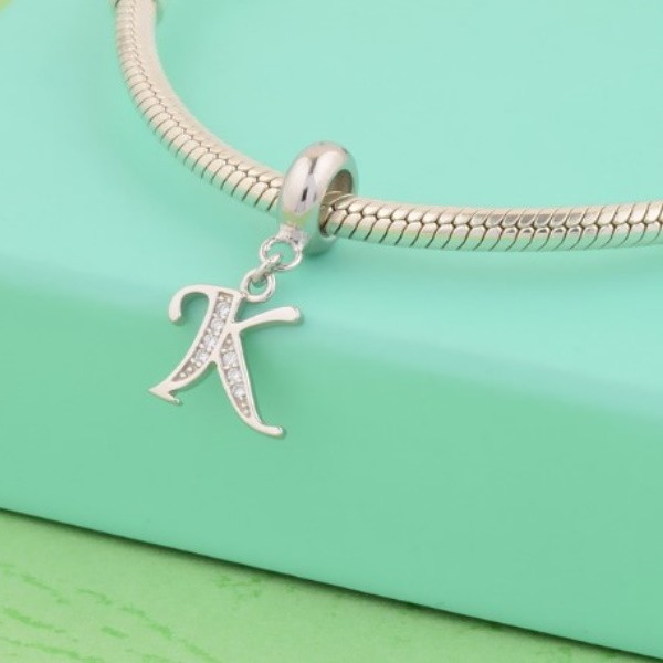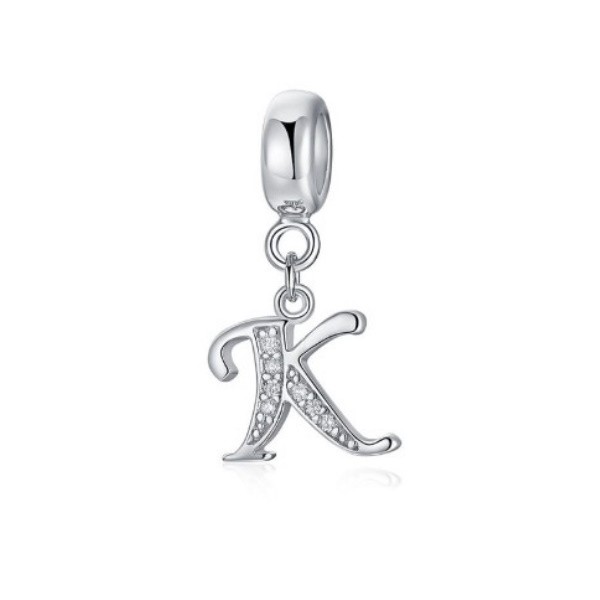 Prívesok zo striebra s vyobrazením písmena K na náramky a náhrdelníky. Veľkosť 2 × 1 cm, váha 0,8 g. Veľkosť otvoru je 0,45 cm Prívesok je kompatibilný s náramkami typu Pandora a Pandora.