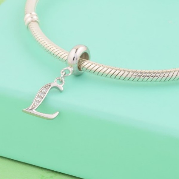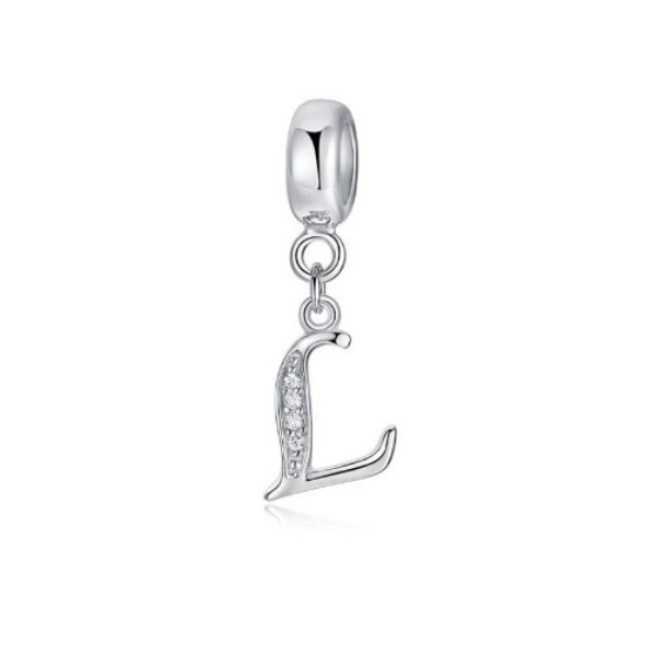 Prívesok zo striebra s vyobrazením písmena L na náramky a náhrdelníky. Veľkosť 2 × 1 cm, váha 0,8 g. Veľkosť otvoru je 0,45 cm Prívesok je kompatibilný s náramkami typu Pandora a Pandora.
