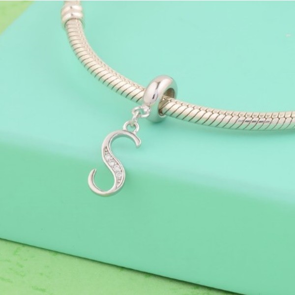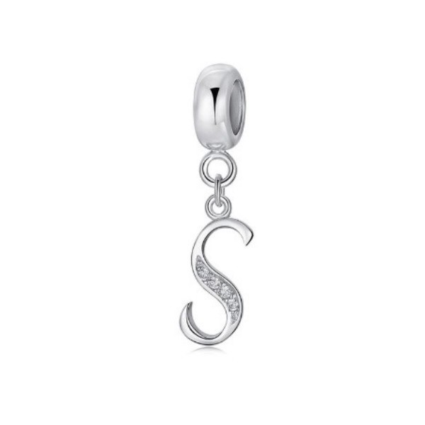 Prívesok zo striebra s vyobrazením písmena S na náramky a náhrdelníky. Veľkosť 2 × 1 cm, váha 0,8 g. Veľkosť otvoru je 0,45 cm Prívesok je kompatibilný s náramkami typu Pandora a Pandora.