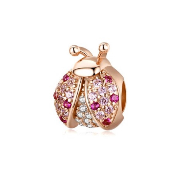Prívesok lienka vyrobený zo striebra vo farbe ružového zlata. Dá sa nosiť na náramku alebo náhrdelníku. Veľkosť 1,1 × 1 cm, váha 2,1 g. Prívesok je kompatibilný s náramkami typu Pandora a Pandora.