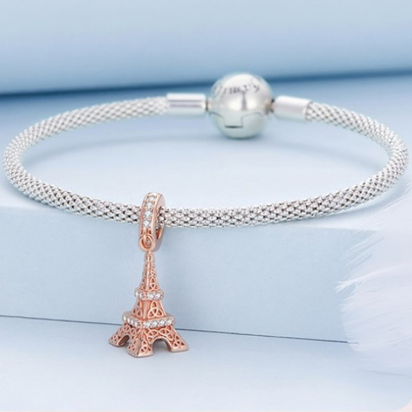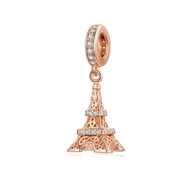 Vyrobené zo striebra, zdobené ružovým zlatom, kúzlo Eiffelovej veže na náramok a náhrdelník. Jeho rozmer je 2,5 × 0,9 cm, priemer otvoru je 0,45 cm. Jeho hmotnosť je 2,3 g. Prívesok je kompatibilný s náramkami typu Pandora a Pandora.