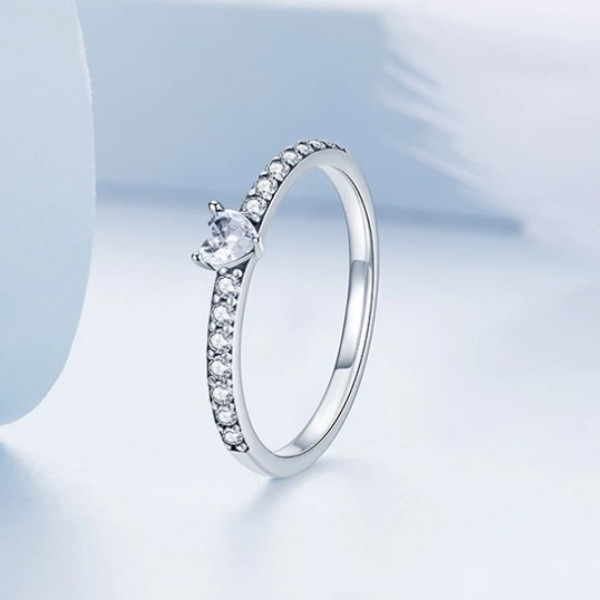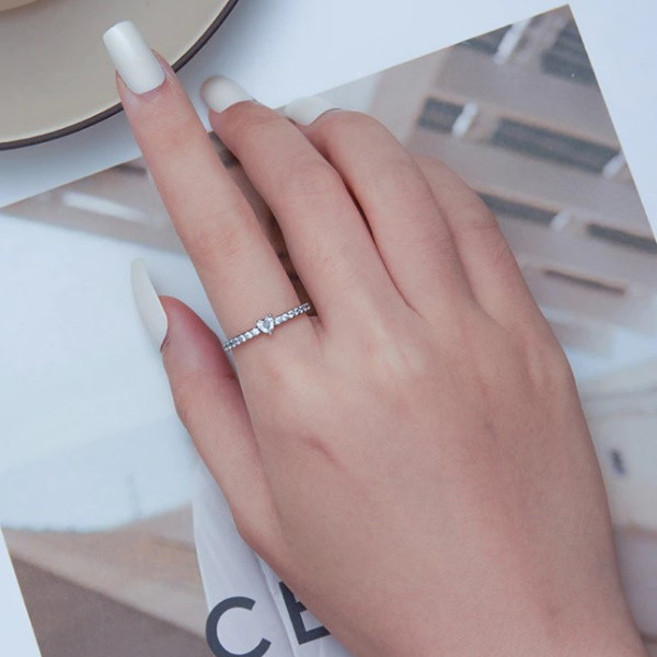 Dámsky zásnubný prsteň vyrobený zo striebra, so srdiečkom zdobeným zirkónovým kryštálom. Jeho hrúbka je 0,2 cm, hmotnosť 1,5 g. Veľkosť srdiečka je 0,4 × 0,4 cm.