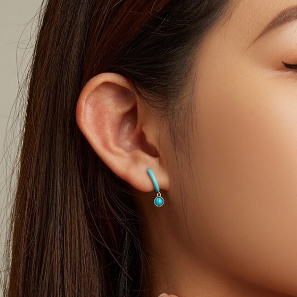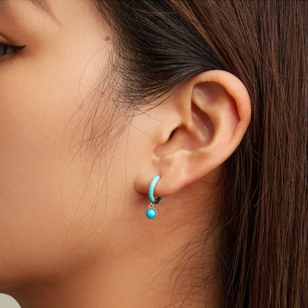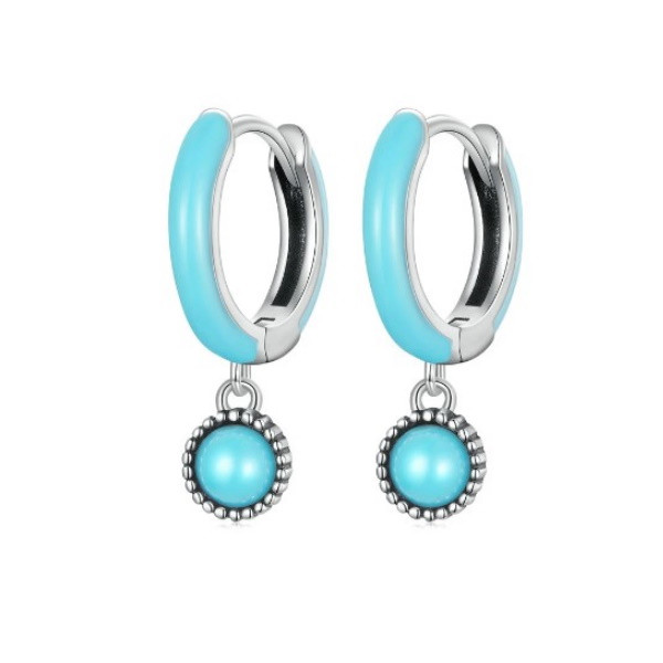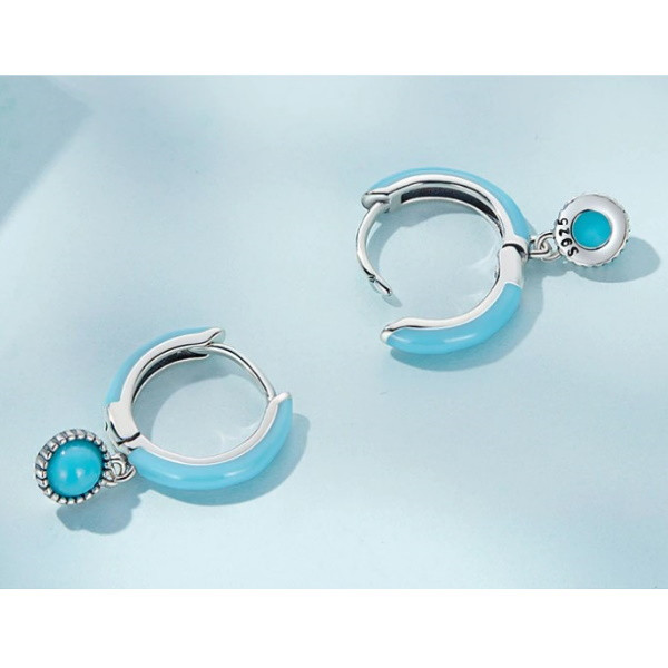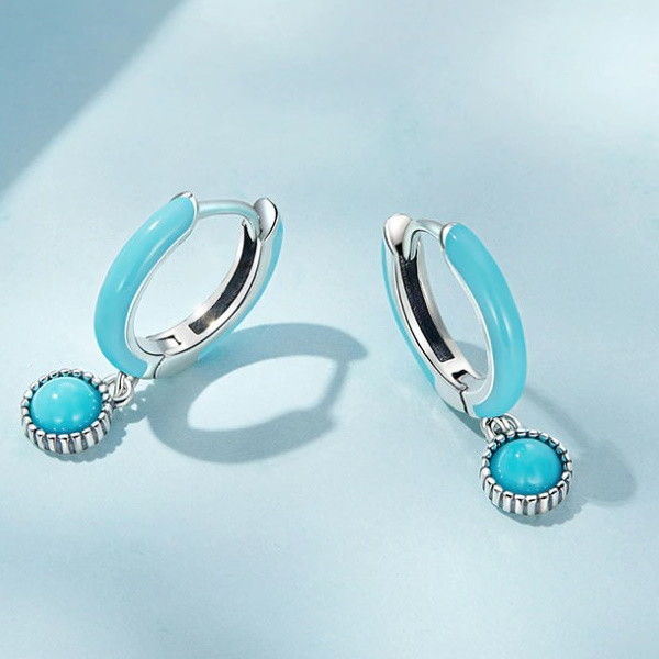 Dámske náušnice vyrobené zo striebra zdobené tyrkysom. Jej výška je 1,9 cm, priemer perly je 0,5 cm. Hmotnosť 1,7 g.