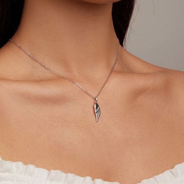 Strieborný náhrdelník s príveskom s anjelskými krídlami. Váži 2,7 g, veľkosť prívesku je 2,2 × 0,8 cm.