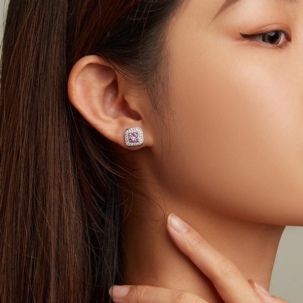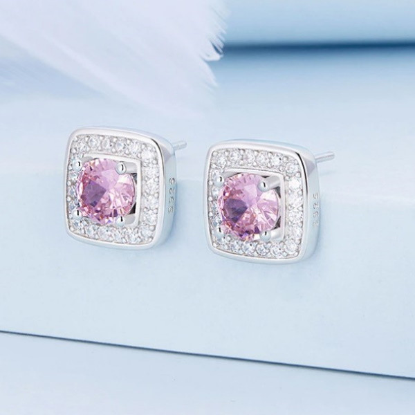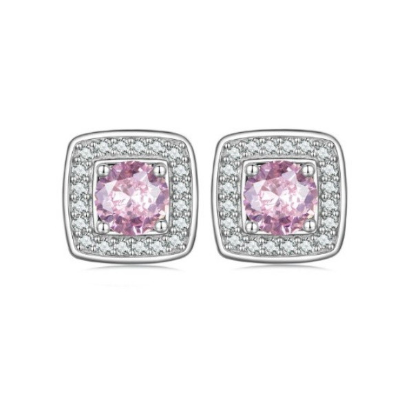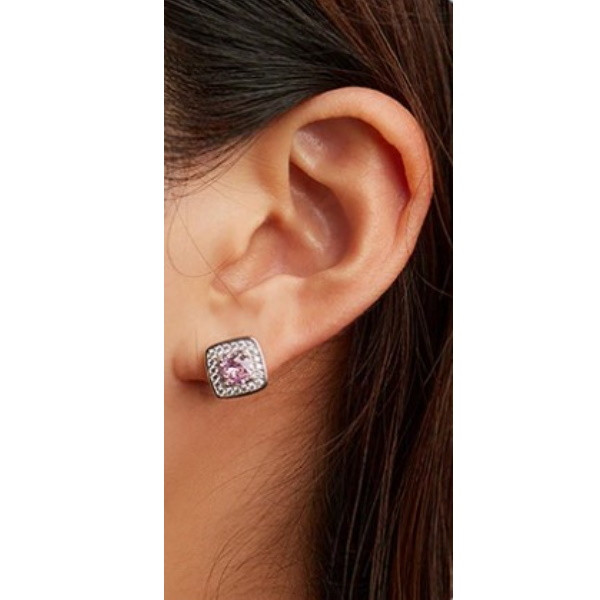 Štvorcové náušnice vyrobené zo striebra, zdobené fialovými kryštálmi zirkónu. Veľkosť 1,1 × 1,1 cm, váha 3,8 g.