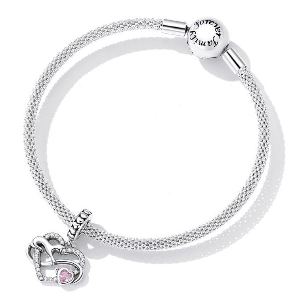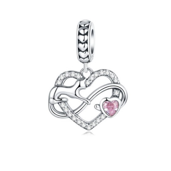 Vyrobené zo striebra, zdobené ružovým zirkónovým kryštálom, na ozdobný náramok a náhrdelník. Veľkosť otvoru je 0,45 cm. Prívesok je kompatibilný s náramkami typu Pandora a Pandora.