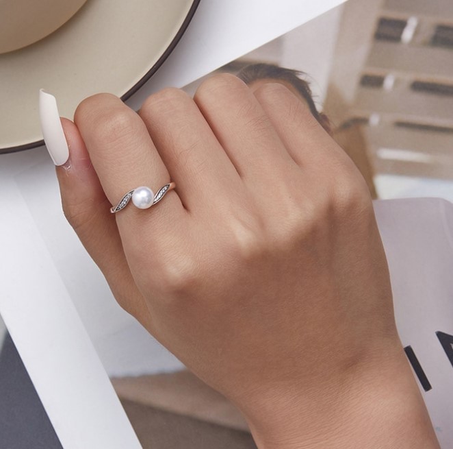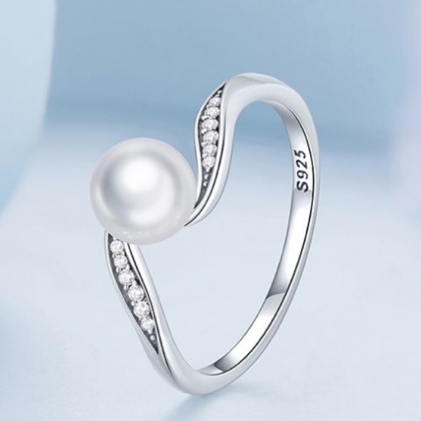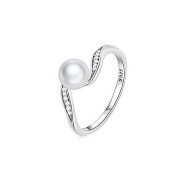 Dámsky zásnubný prsteň vyrobený zo striebra, zdobený zirkónovým kryštálom a kúskom bielej perly. Jeho hrúbka je 0,15 cm, hmotnosť 1,4 g.