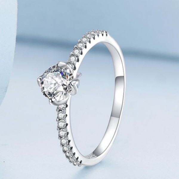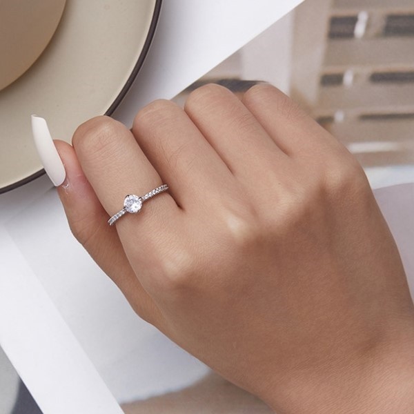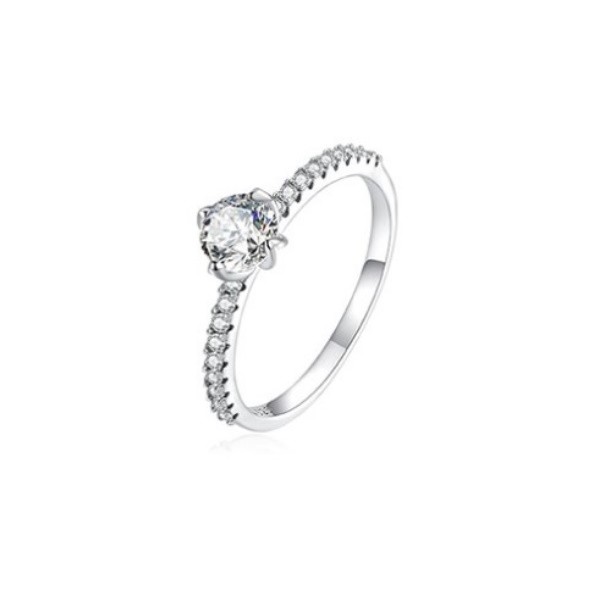 Dámsky zásnubný prsteň vyrobený zo striebra, zdobený zirkónovým kryštálom. Hrúbka 0,2 cm, váha 1,5 g.