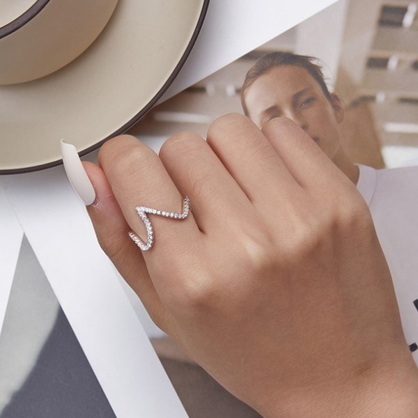 Dámsky prsteň zo striebra, nepravidelného tvaru, zdobený bielym zirkónovým kryštálom. Hrúbka 0,14 cm, váha 1,8 g.