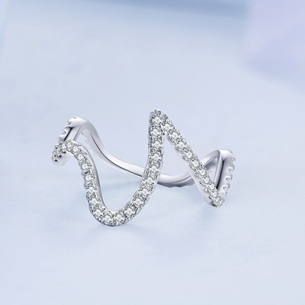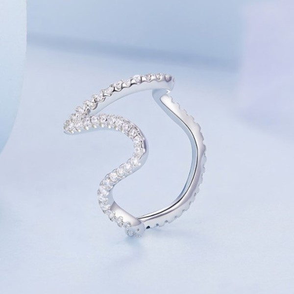 Dámsky prsteň zo striebra, nepravidelného tvaru, zdobený bielym zirkónovým kryštálom. Hrúbka 0,14 cm, váha 1,8 g.