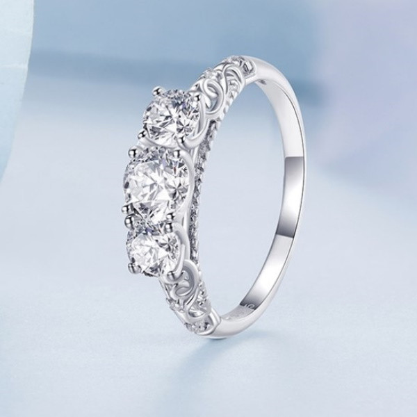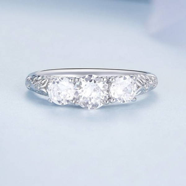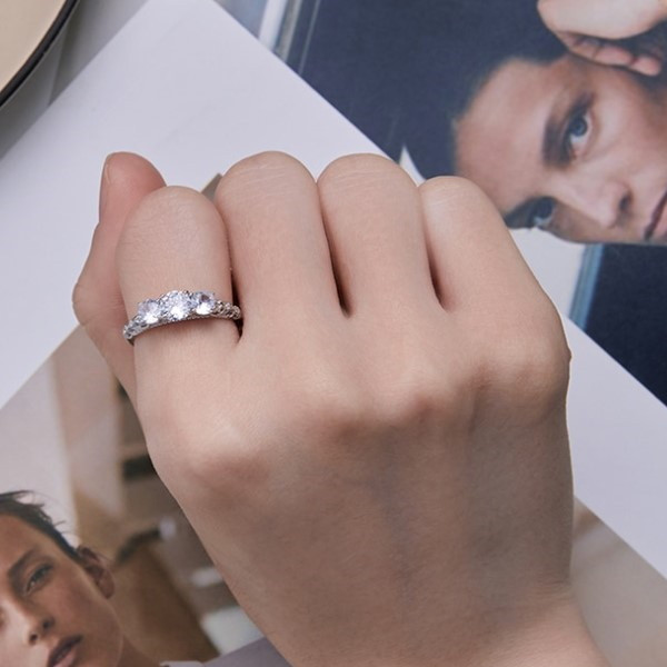 Elegantný dámsky zásnubný prsteň vyrobený zo striebra, zdobený bielymi kryštálmi zirkónu. Hrúbka 0,2 cm, hmotnosť 1,7 g.