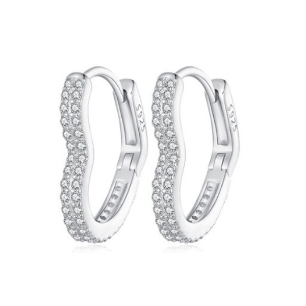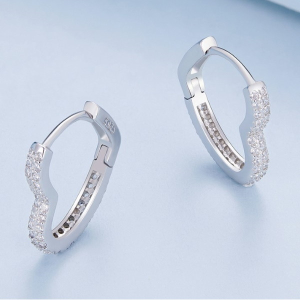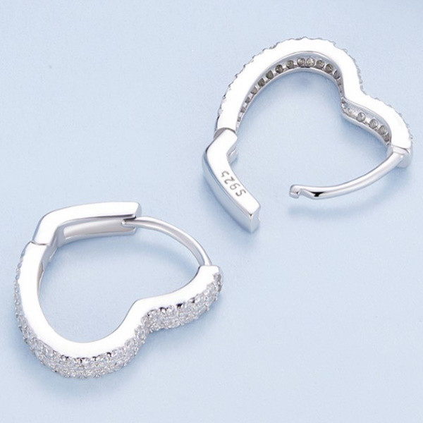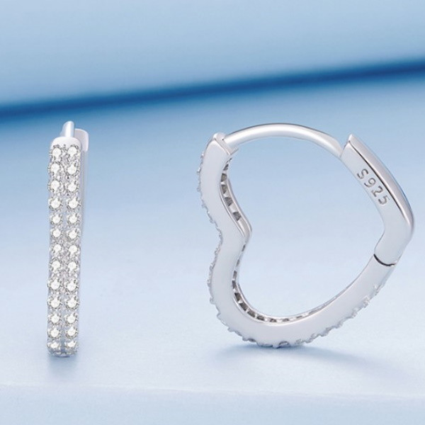 Dámske náušnice v tvare srdca vyrobené zo striebra, zdobené bielym zirkónovým kryštálom. Veľkosť 1,6 × 0,25 cm, váha 2 g.