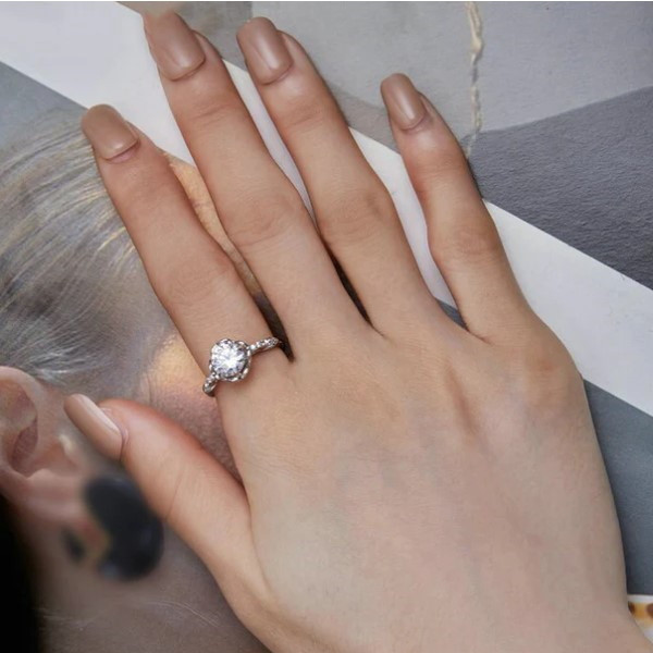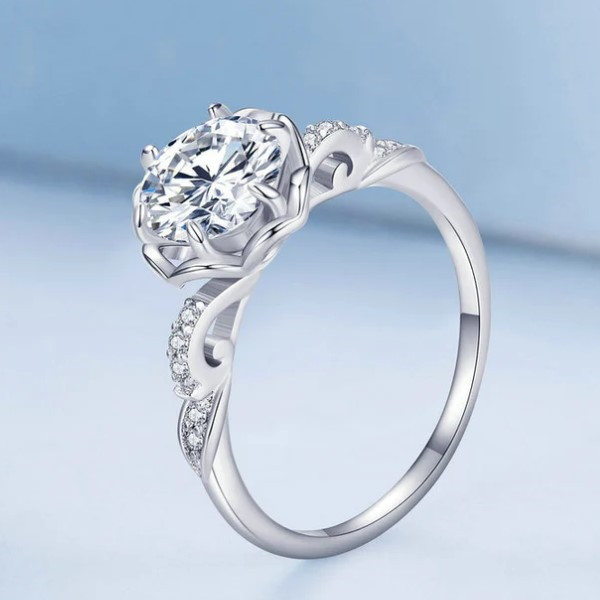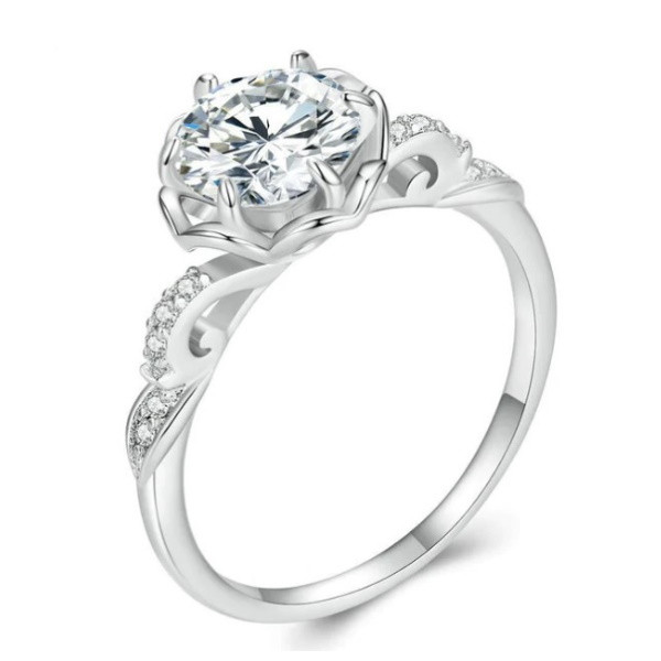 Dámsky zásnubný prsteň romantického štýlu vyrobený zo striebra, zdobený zirkónovým kryštálom. Jeho hrúbka je 0,13 cm, hmotnosť 2,2 g.