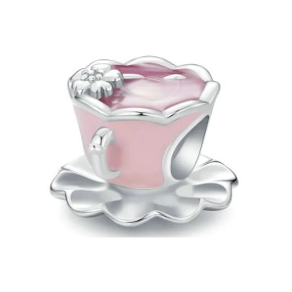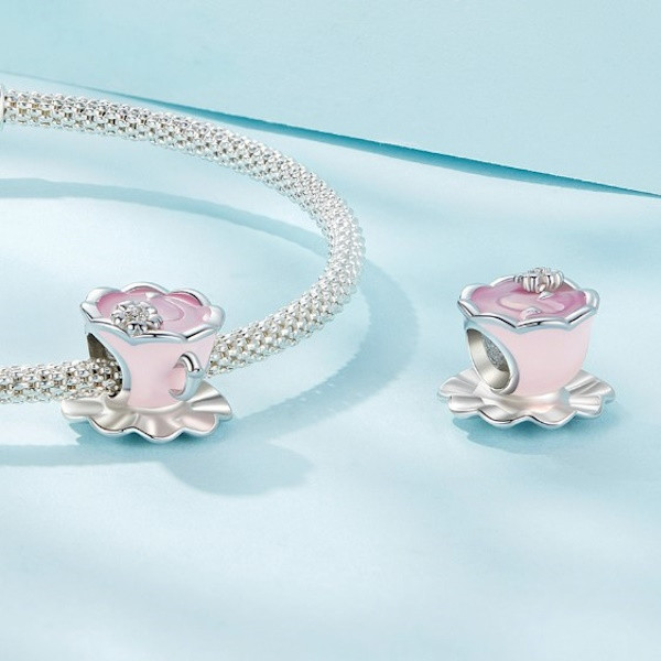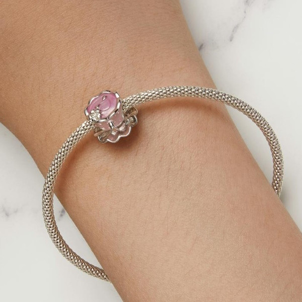 Vyrobené zo striebra, zdobené ružovým smaltom, na prívesný náramok a náhrdelník. Veľkosť 1,0 × 1,2 cm, váha 2,7 g. Veľkosť otvoru je 0,45 cm.