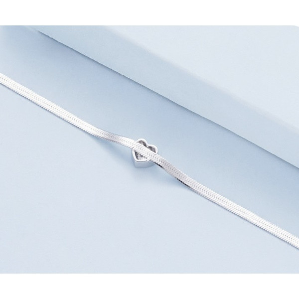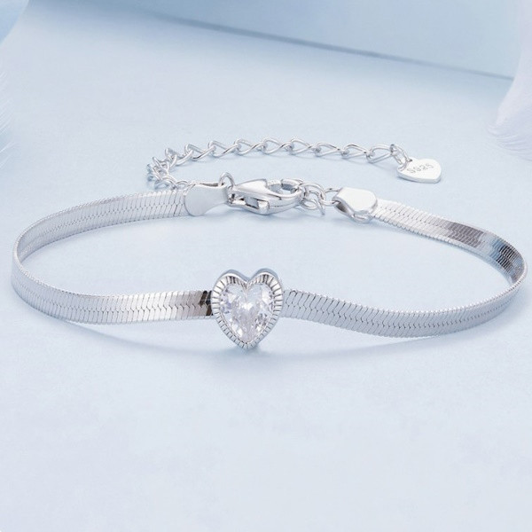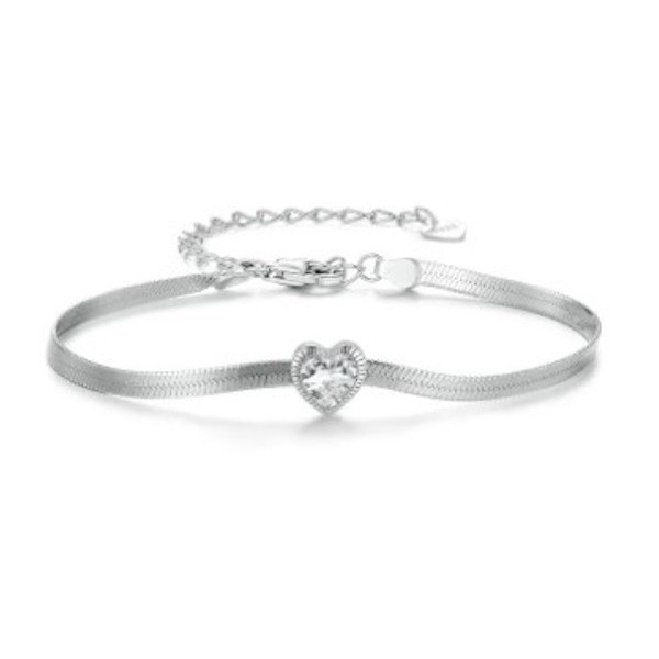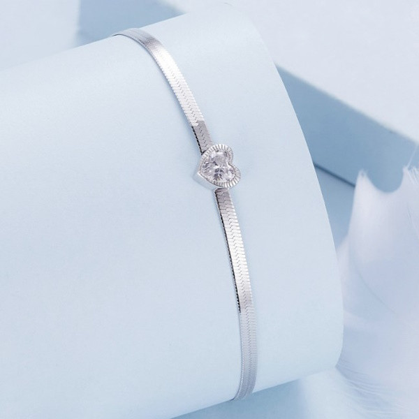 Náramok z rybej kosti vyrobený zo striebra, zdobený srdiečkom vykladaným zirkónovými kryštálmi. Dĺžka 15 + 6 cm, váha 2,8 g.