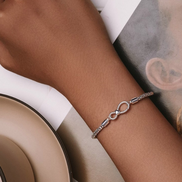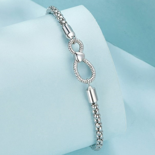 Elegantný strieborný náramok zdobený znakom nekonečna. Dĺžka 19 cm, váha 4,5 g Rozmer nekonečného okraja je 0,8 × 1,8 cm.