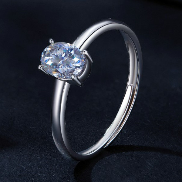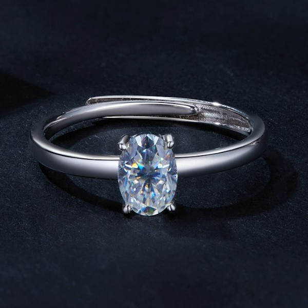 Dámsky prsteň vyrobený zo striebra zdobený moissanitovým kryštálom v tvare vajíčka. Jeho šírka je 2,1 mm, hmotnosť 1,9 g.