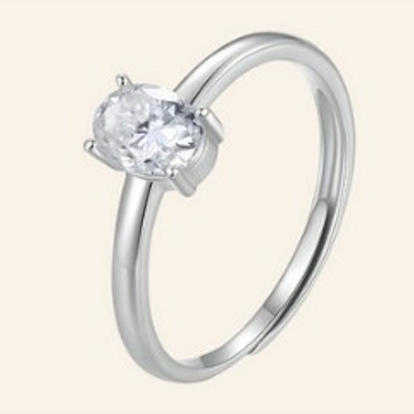 Dámsky prsteň vyrobený zo striebra zdobený moissanitovým kryštálom v tvare vajíčka. Jeho šírka je 2,1 mm, hmotnosť 1,9 g.