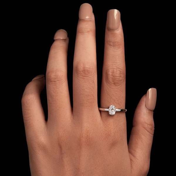 Dámsky prsteň vyrobený zo striebra zdobený moissanitovým kryštálom v tvare vajíčka. Jeho šírka je 2,1 mm, hmotnosť 1,9 g.