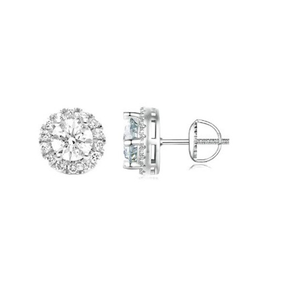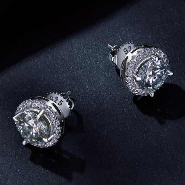 Dámske strieborné náušnice zdobené kryštálmi zirkónu a moissanitu. Veľkosť 1,0 × 1,0 cm, váha 2,9 g.