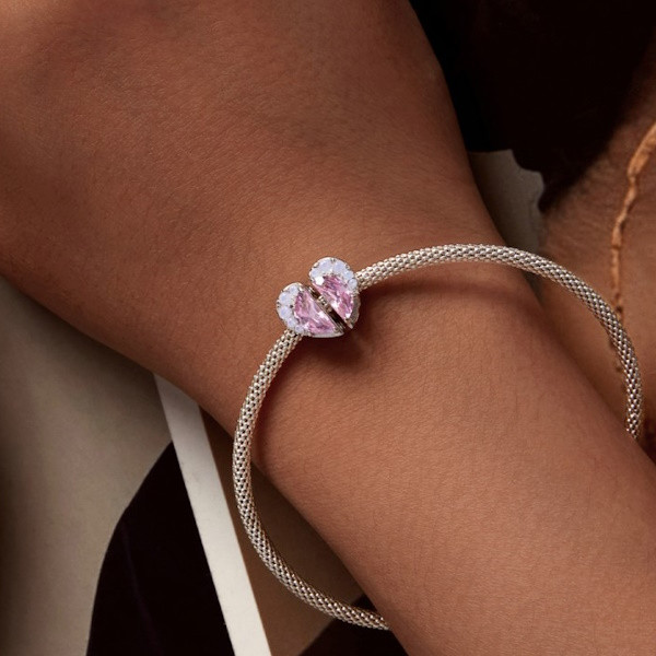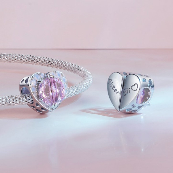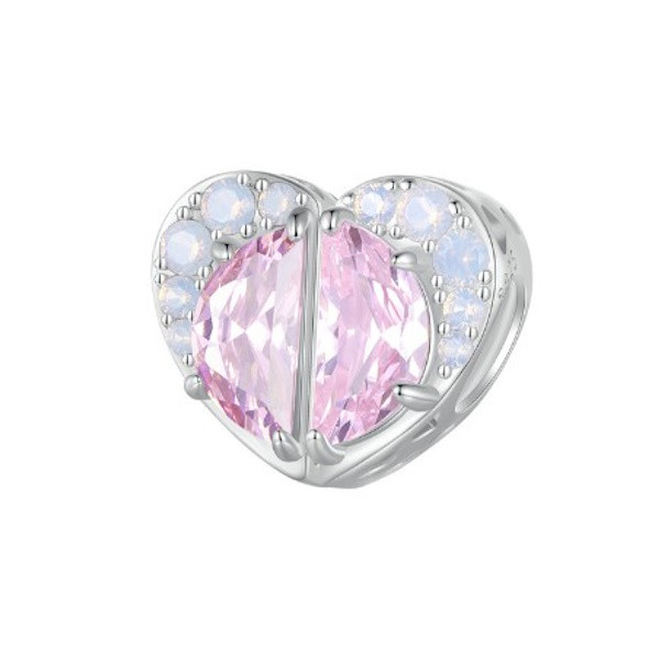 Srdiečkové kúzlo zo striebra, zdobené priehľadným ružovým sklom, na náramky a náhrdelníky. Veľkosť 1,1 × 1,2 cm, váha 2,4 g. Priemer otvoru je 0,45 cm.