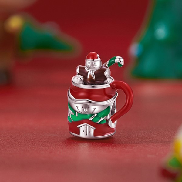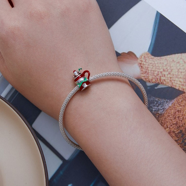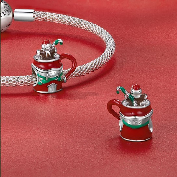 Zábavný kúzelný náramok a náhrdelník zobrazujúci vianočný hrnček so snehuliakom vyrobený zo striebra. Veľkosť 1,4 × 1,2 cm, váha 2,3 g.