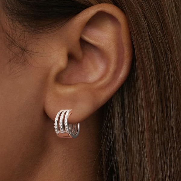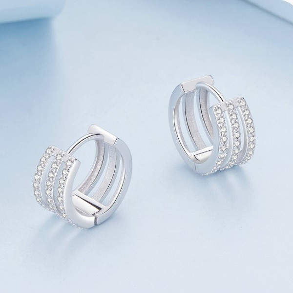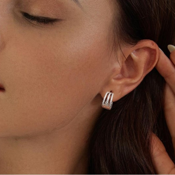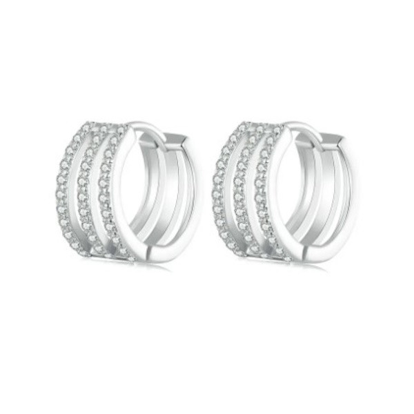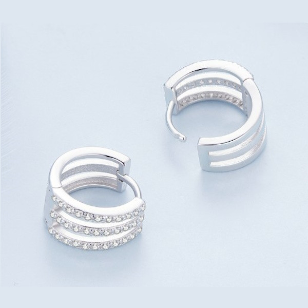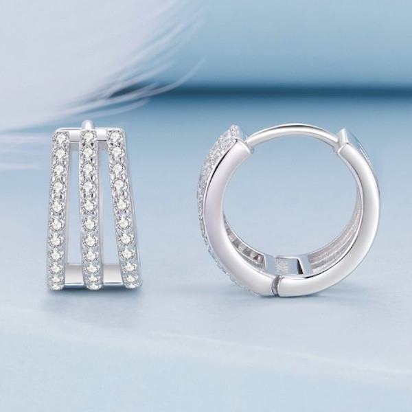 Dámske náušnice zo striebra, každý z troch obrúčok, zdobené zirkónovými kryštálmi. Vonkajší rozmer 1,2 × 0,7 cm, vnútorný priemer 0,9 cm, hmotnosť 3,2 g.