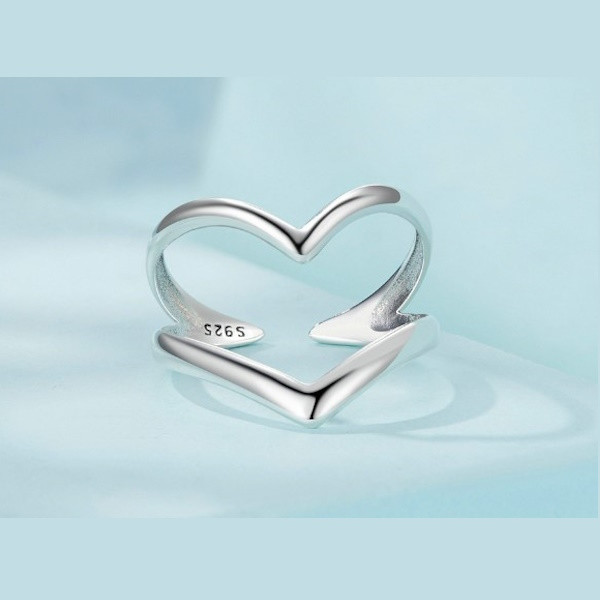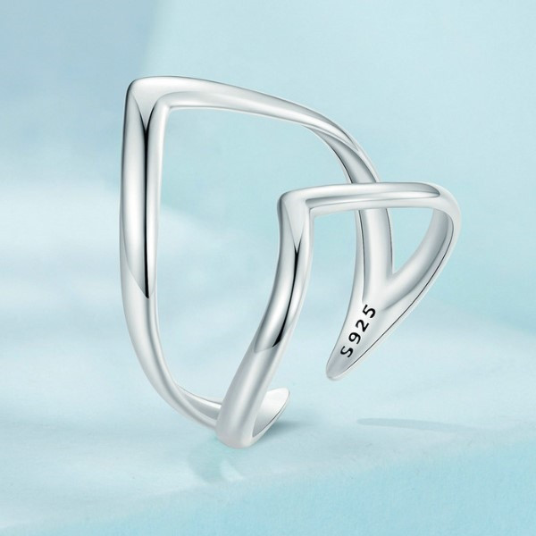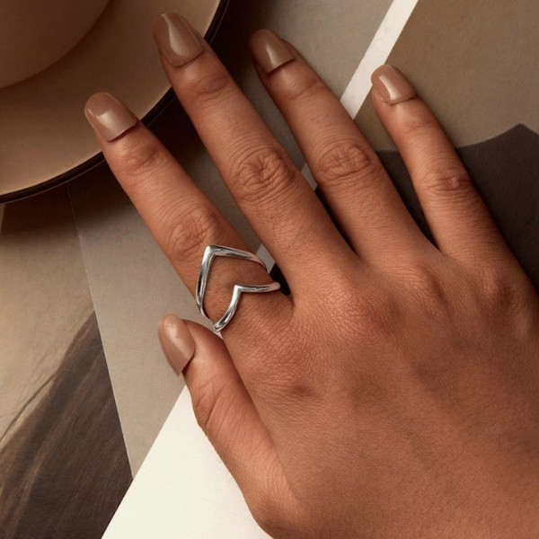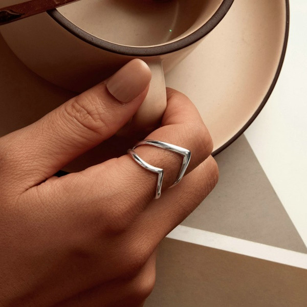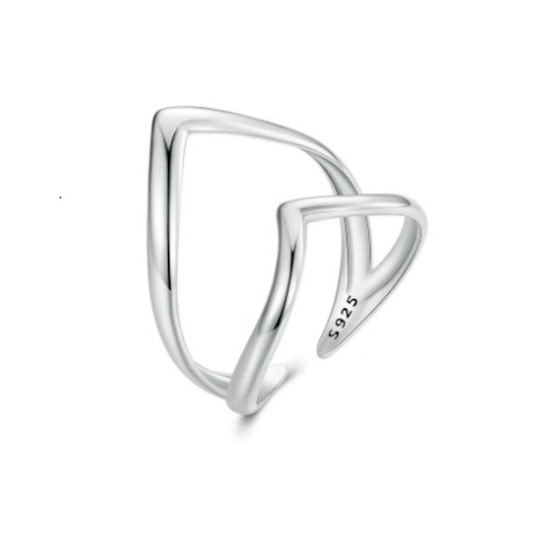 Otvorený dámsky prsteň v tvare V zo striebra s modernými líniami. 2,5-15 mm, hmotnosť 2,2 g.