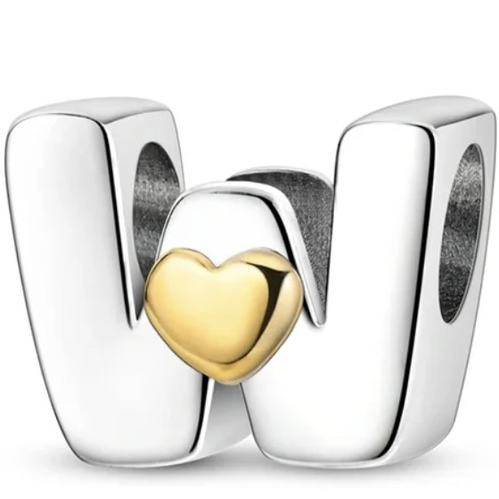 Prívesok znázorňujúci písmeno vyrobené zo striebra 925, zdobené zlatým srdiečkom.