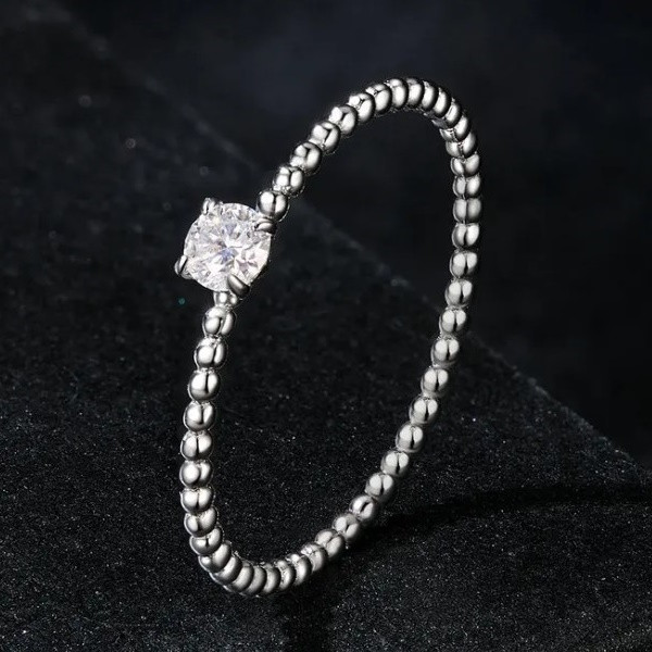 Dámsky zásnubný prsteň vyrobený zo striebra zdobený moissanitovým kryštálom. Jeho šírka je 1,1 mm, hmotnosť 0,5 g.