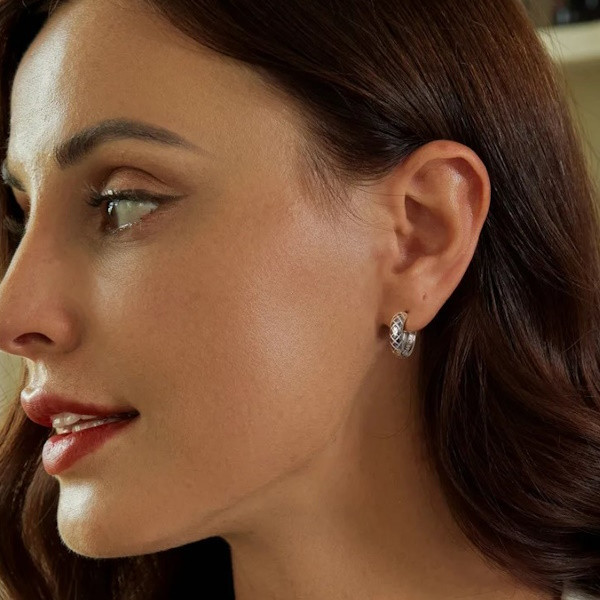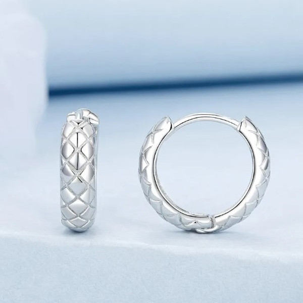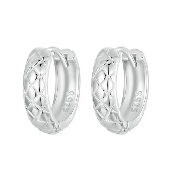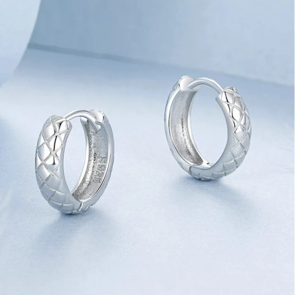 Dámske kruhové náušnice vyrobené zo striebra, zdobené diamantovým vzorom. Veľkosť 13×4 mm, hmotnosť 2 g.