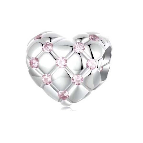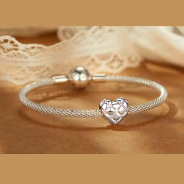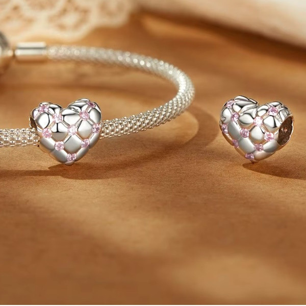 Vyrobené zo striebra, zdobené ružovým zirkónovým kryštálom, na ozdobný náramok a náhrdelník. Veľkosť 1,1 × 1,2 cm, váha 2,2 g. Veľkosť otvoru je 0,45 cm.