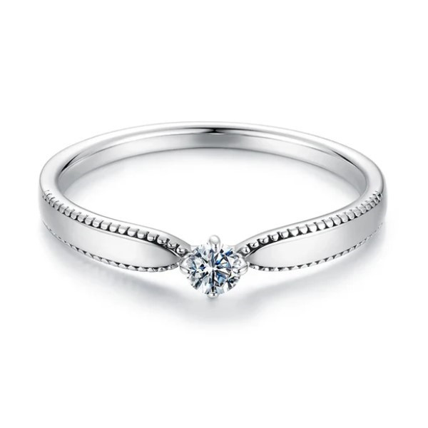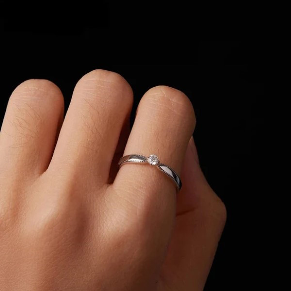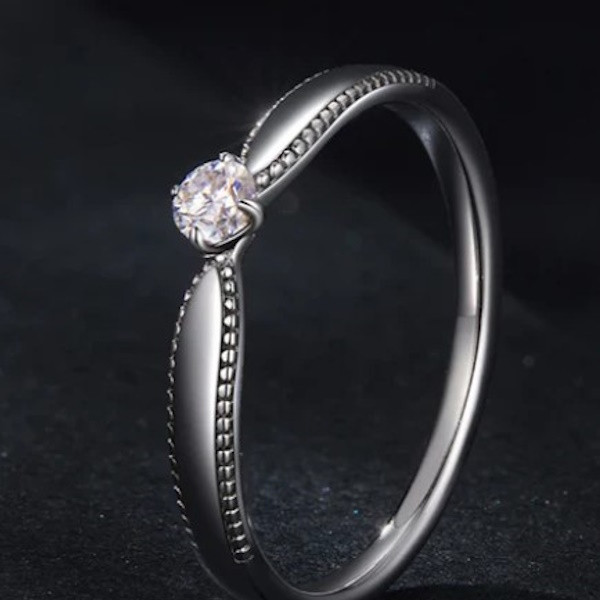 Dámsky zásnubný prsteň vyrobený zo striebra, zdobený moissanitovým kryštálom. Jeho šírka je 0,15 cm, váha 1,3 g, priemer kryštálu 0,3 cm.