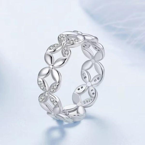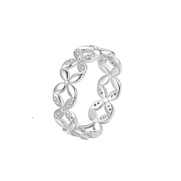Dámsky prsteň vyrobený zo striebra, zdobený zirkónovým kryštálom, v tvare kvetinovej girlandy. Jeho šírka je 0,6 cm, hmotnosť 2,1 g.