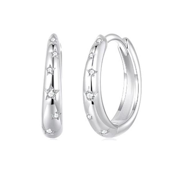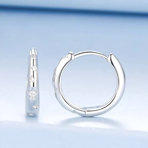 Dámske klipsové náušnice vyrobené zo striebra, zdobené bielymi kryštálmi zirkónu. Vonkajší priemer 1,3 cm, vnútorný priemer 1,0 cm, šírka 0,3 cm. Jeho hmotnosť je 1,5 g.