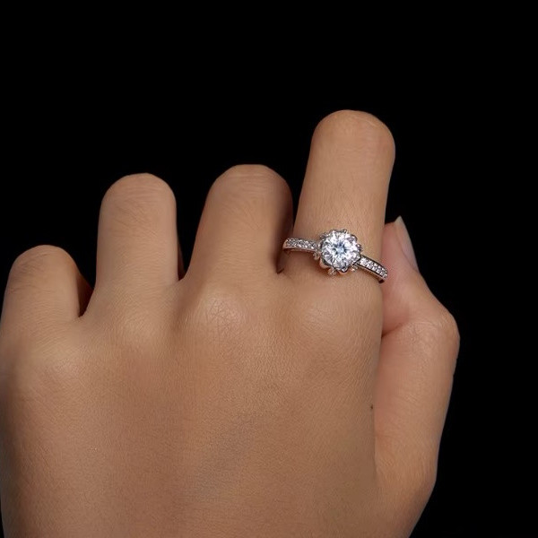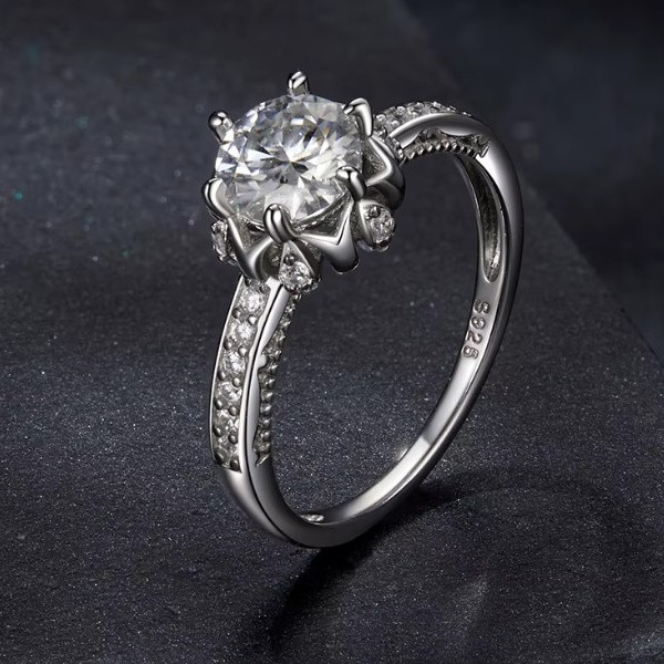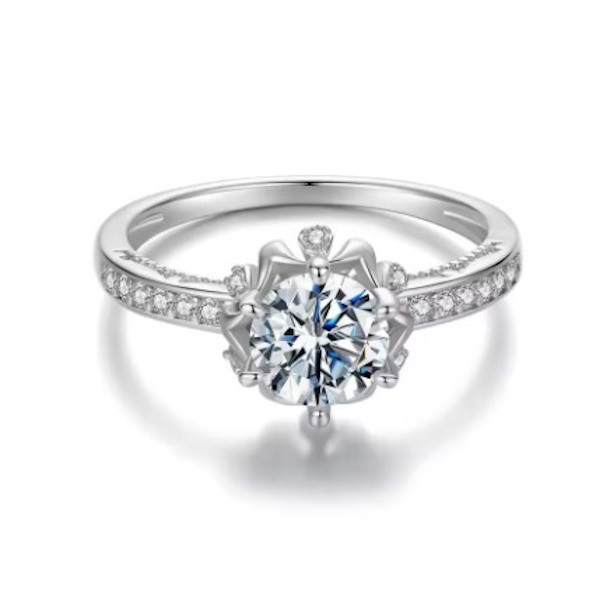 Dámsky prsteň vyrobený zo striebra, zdobený kryštálmi zirkónu a moissanitu. Jeho šírka je 0,18 cm, priemer kvetu je cca. 0,65 cm.