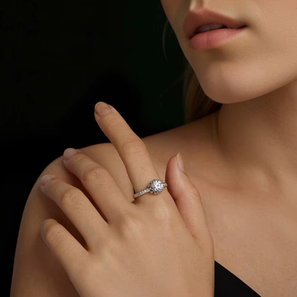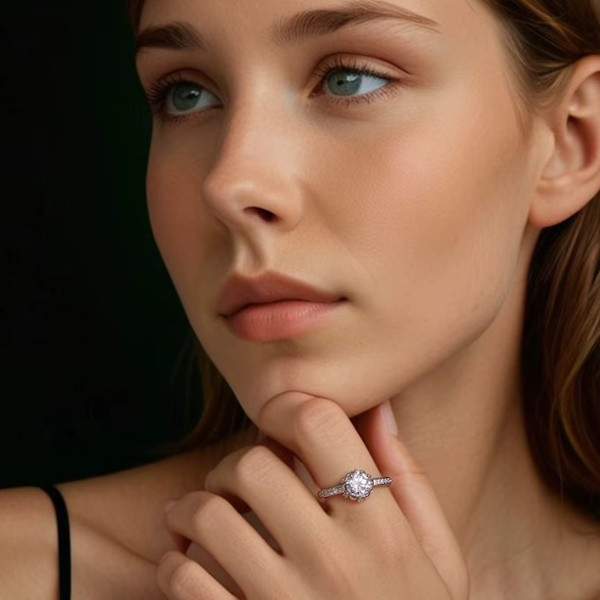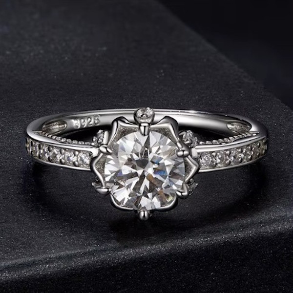 Dámsky prsteň vyrobený zo striebra, zdobený kryštálmi zirkónu a moissanitu. Jeho šírka je 0,18 cm, priemer kvetu je cca. 0,65 cm.