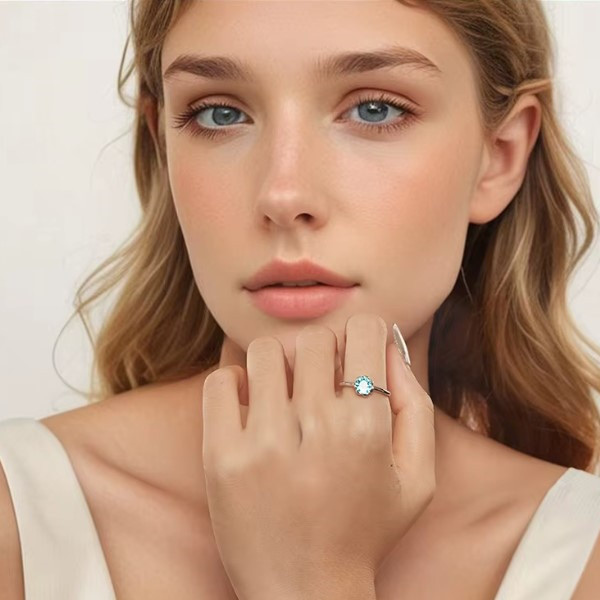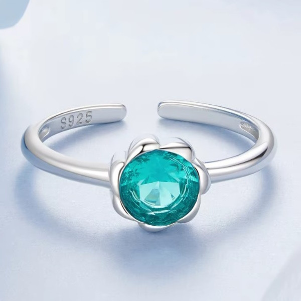 Nastaviteľný dámsky prsteň vyrobený zo striebra, zdobený bielym zlatom a priehľadným sklom. Jeho šírka je 0,17 cm, hmotnosť 2,0 g a priemer skla 0,8 cm.