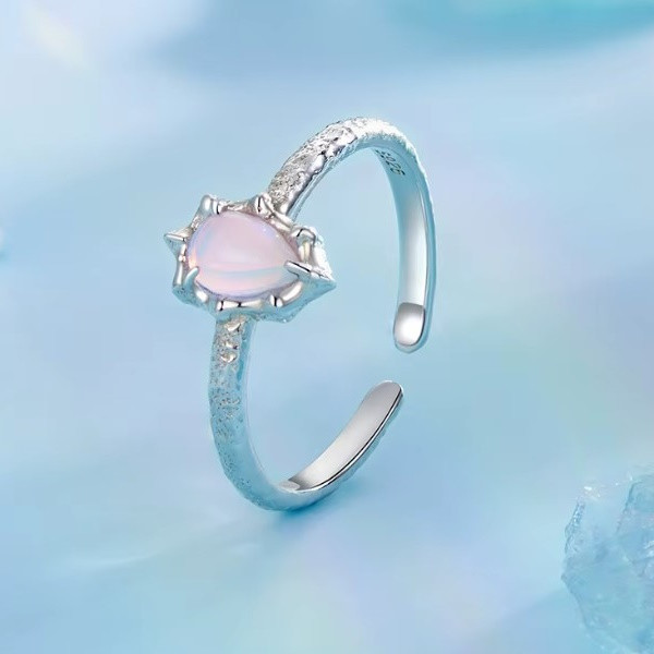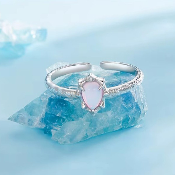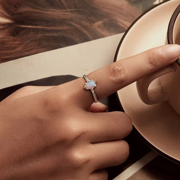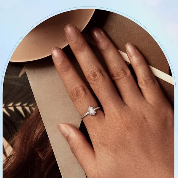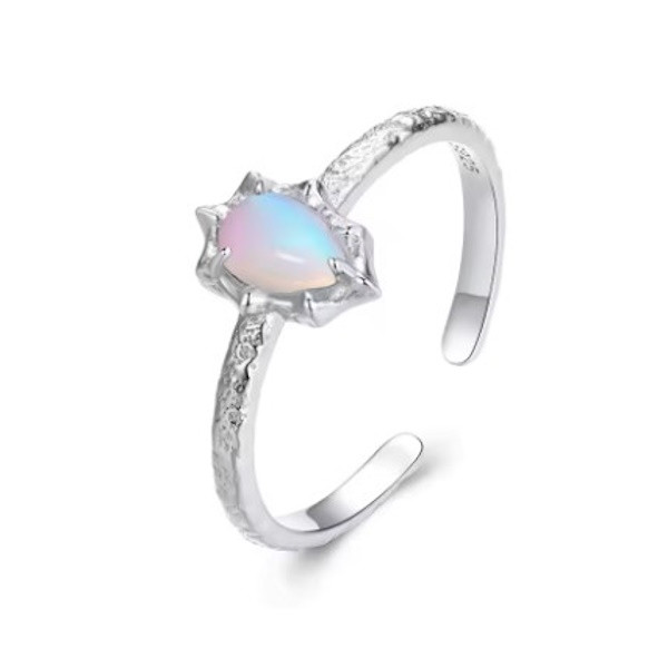 Dámsky prsteň vyrobený zo striebra, zdobený syntetickým opálom a povlakom z bieleho zlata, nastaviteľná veľkosť. Jeho šírka je 0,19 cm, hmotnosť je 1,4 g. Veľkosť opálu je 0,9 × 0,7 cm.