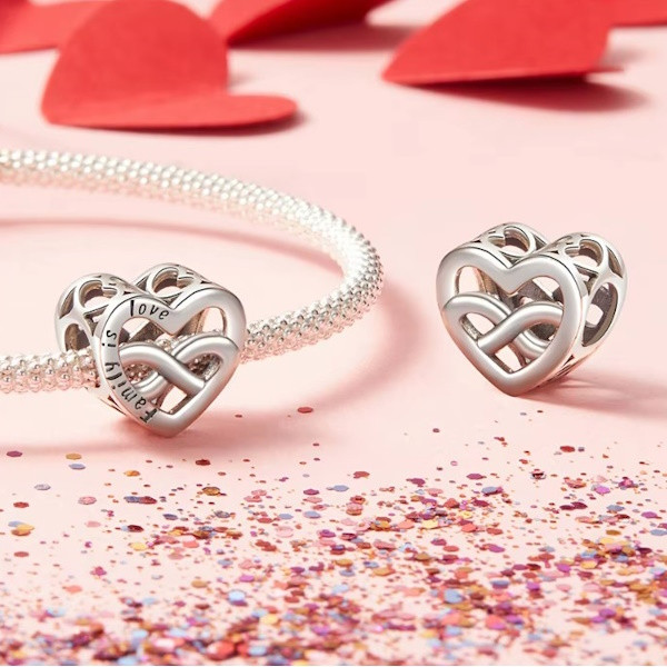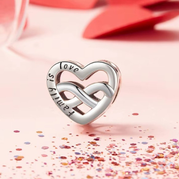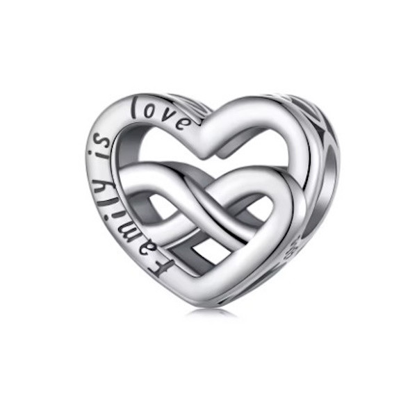 Prívesok zo striebra s nápisom "Rodina je láska". Dá sa nosiť na náramku alebo náhrdelníku. Veľkosť 1,2 × 1,1 cm, váha 2 g. Priemer otvoru je 0,45 cm.