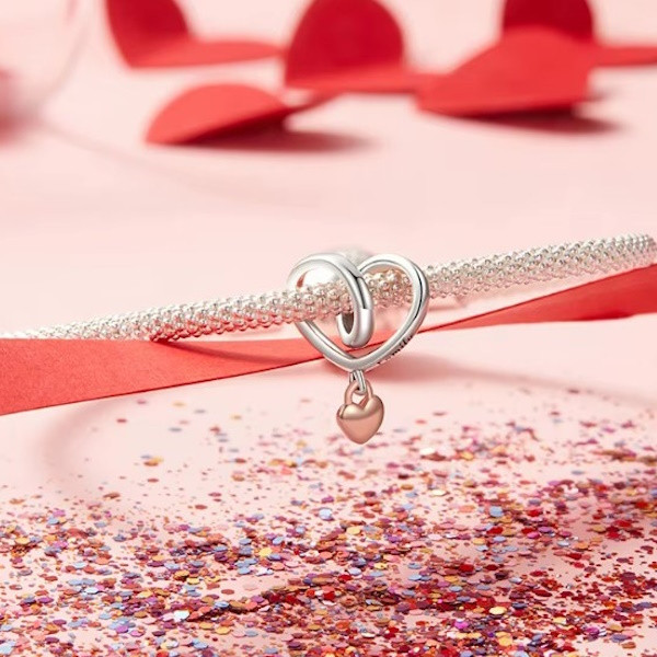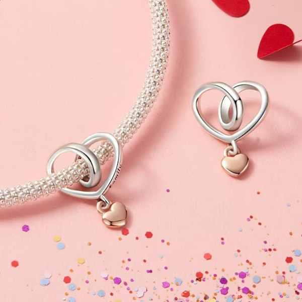 Vyrobené zo striebra, zdobené ružovým zlatom, na náramku a náhrdelníku. Veľkosť 1,5 × 1,2 cm, váha 0,9 g. Veľkosť otvoru je 0,45 cm.