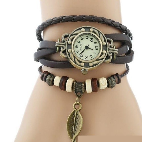 Dámsky kožený náramok hodiniek s anjelskými krídlami, kávovo hnedý