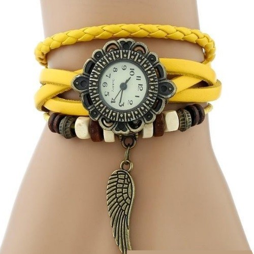 Kožený dámsky náramok hodiniek Angel wings, žltý